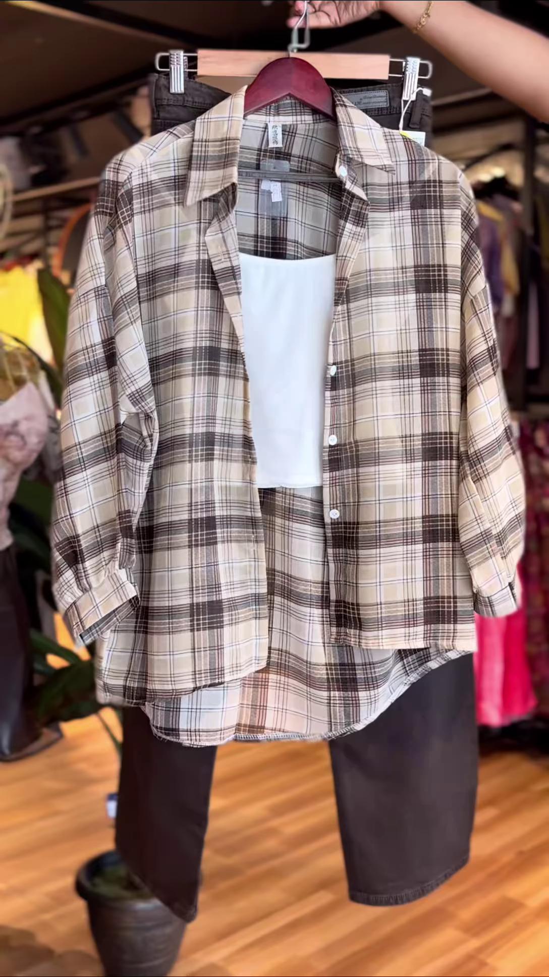 Be the first to review “Classic Beige Checkered Shirt Co-ord Set with White Tank & Black Pants – nehaff.com”