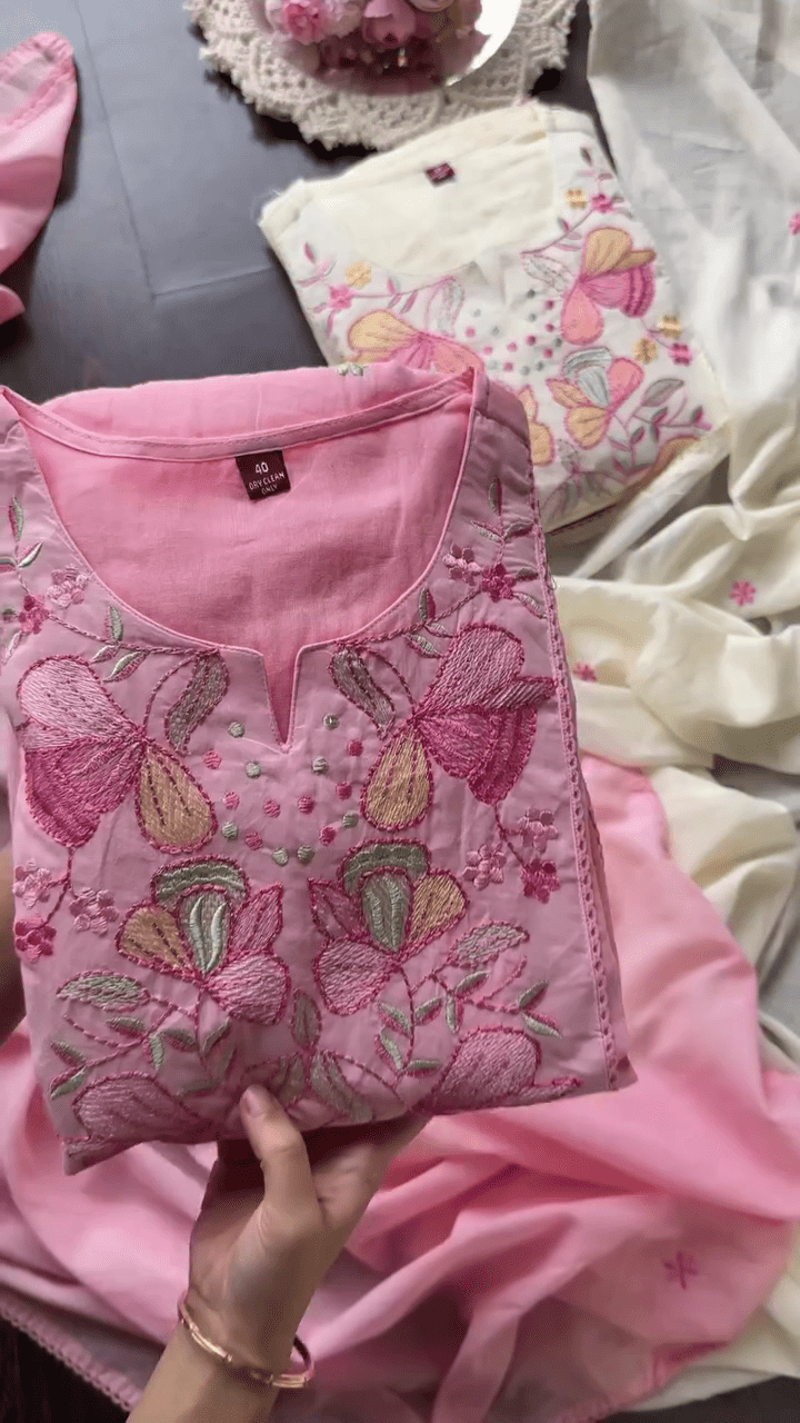 Celebrate the charm of traditional craftsmanship with this beautifully designed cotton kurti set, blending comfort with refined detailing. Accented with intricate multicolor floral thread embroidery and subtle mirror work, this set is perfect for festive gatherings, casual outings, and graceful everyday wear.
